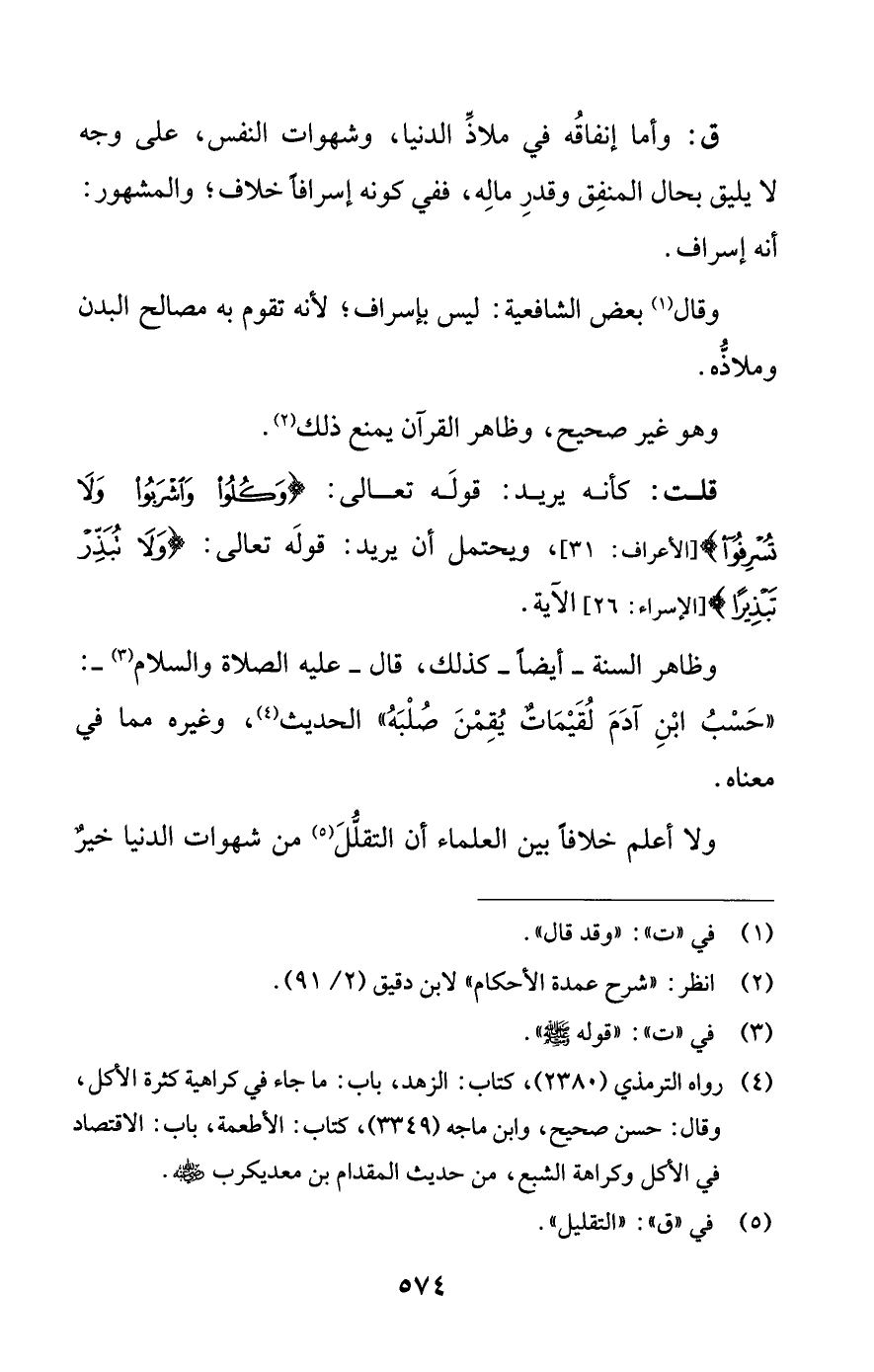 قلت: كأنه يريد: قولَه تعالى: {وَكُلُوا وَاشْرَبُوا وَلَا تُسْرِفُوا} [الأعراف: 31]، ويحتمل أن يريد: قولَه تعالى: {وَلَا تُبَذِّرْ تَبْذِيرًا} [الإسراء: 26] الآية.