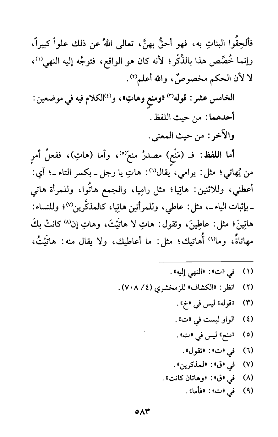 الخامس عشر: قوله (¬3) "ومنعٍ وهاتِ"، و (¬4) الكلام فيه في موضعين: