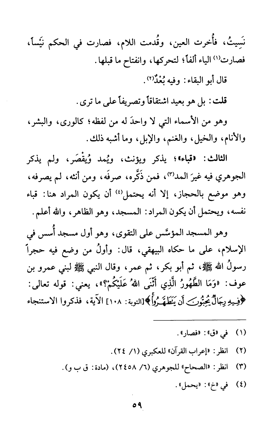 الثالث: «قباء»؛ يذكر ويؤنث، ويمد ويقصر، ولم يذكر الجوهري فيه غير المد (¬3)، فمن ذكره، صرفه، ومن أنثه، لم يصرفه، وهو موضع بالحجاز، إلا أنه يحتمل (¬4) أن يكون المراد هنا: قباء نفسه، ويحتمل أن يكون المراد: المسجد، وهو الظاهر، والله أعلم.