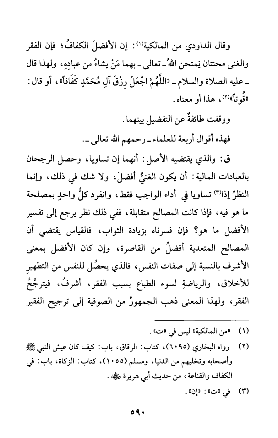 وقال الداودي من المالكية (¬1): إن الأفضلَ الكفافُ؛ فإن الفقر والغنى محنتان يَمتحن اللَّهُ -تعالى- بهما مَنْ يشاءُ من عبادِهِ، ولهذا قال -عليه الصلاة والسلام- "اللَّهُمَّ اجْعَلْ رِزْقَ آلِ مُحَمَّدٍ كَفَافًا"، أو قال: "قُوتًا" (¬2)، هذا أو معناه.