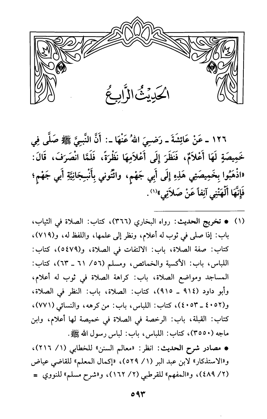 126 - عَنْ عَائِشَةَ -رَضِيَ اللَّهُ عَنْهَا-: أَنَّ النَّبِيَّ -صلى اللَّه عليه وسلم- صَلَّى فِي خَمِيصَةٍ لَهَا أَعْلَامٌ، فَنَظَرَ إِلَى أَعْلَامِهَا نظرَةً، فَلَمَّا انْصَرَفَ، قَالَ: "اذْهَبُوا بِخَمِيصَتِي هَذِهِ إِلَى أَبِي جَهْمٍ، وائْتُوني بِأَنْبِجَانِيَّةِ أَبي جَهْمٍ؛ فَإِنَّهَا أَلْهَتْنِي آنِفًا عَنْ صَلَاتِي" (¬1).