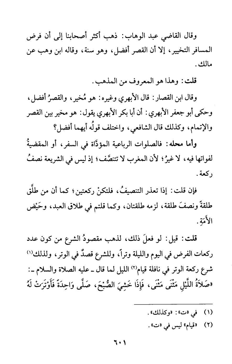 وقال القاضي عبد الوهاب: ذهب أكثر أصحابنا إلى أن فرض المسافر التخيير، إلا أن القصر أفضل، وهو سنة، وقاله ابن وهب عن مالك.