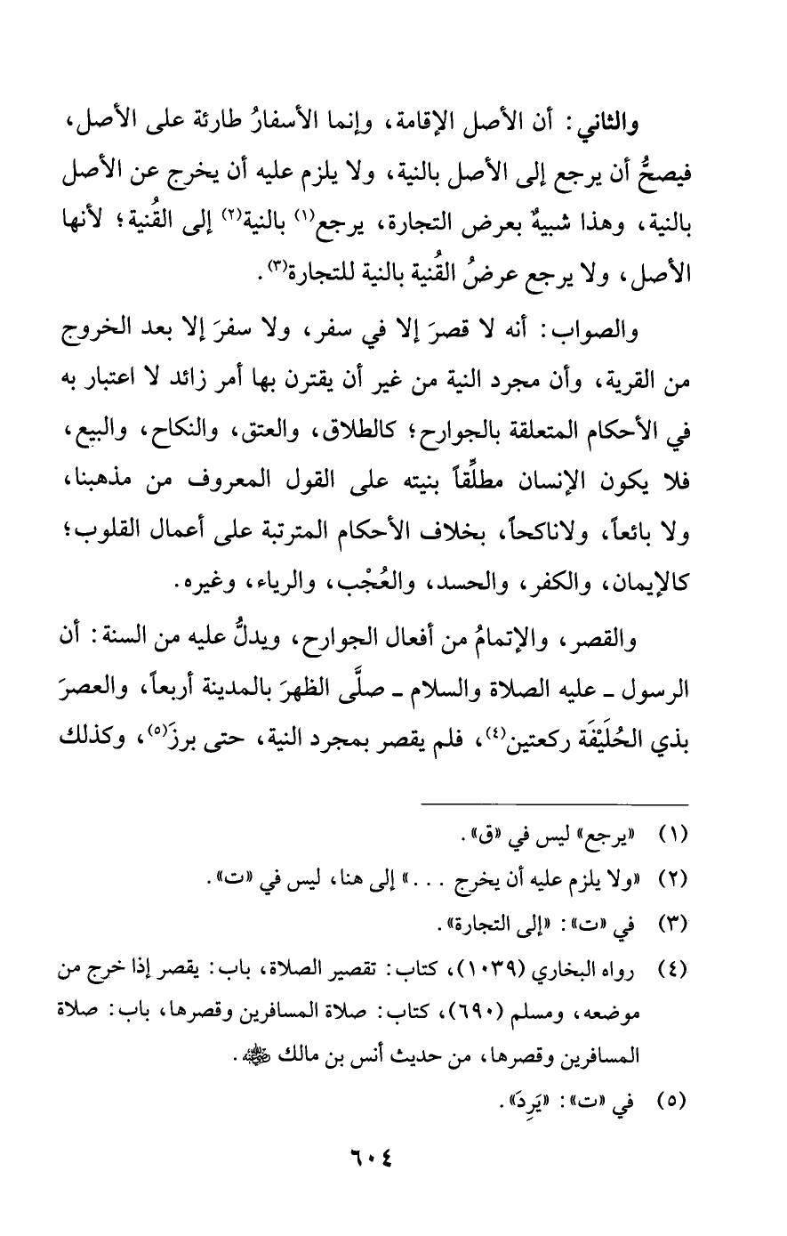 والصواب: أنه لا قصرَ إلا في سفر، ولا سفرَ إلا بعد الخروج من القرية، وأن مجرد النية من غير أن يقترن بها أمر زائد لا اعتبار به في الأحكام المتعلقة بالجوارح؛ كالطلاق، والعتق، والنكاح، والبيع، فلا يكون الإنسان مطلِّقًا بنيته على القول المعروف من مذهبنا، ولا بائعًا، ولا ناكحًا، بخلاف الأحكام المترتبة على أعمال القلوب؛ كالإيمان، والكفر، والحسد، والعُجْب، والرياء، وغيره.