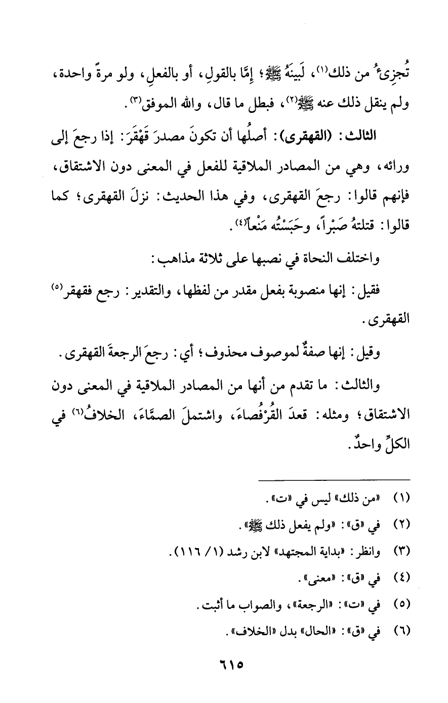 الثالث: (القهقرى): أصلُها أن تكونَ مصدرَ قَهْقَرَ: إذا رجعَ إلى ورائه، وهي من المصادر الملاقية للفعل في المعنى دون الاشتقاق، فإنهم قالوا: رجعَ القهقرى، وفي هذا الحديث: نزلَ القهقرى؛ كما قالوا: قتلتهُ صَبْرًا، وحَبَسْتُه مَنْعًا (¬4).