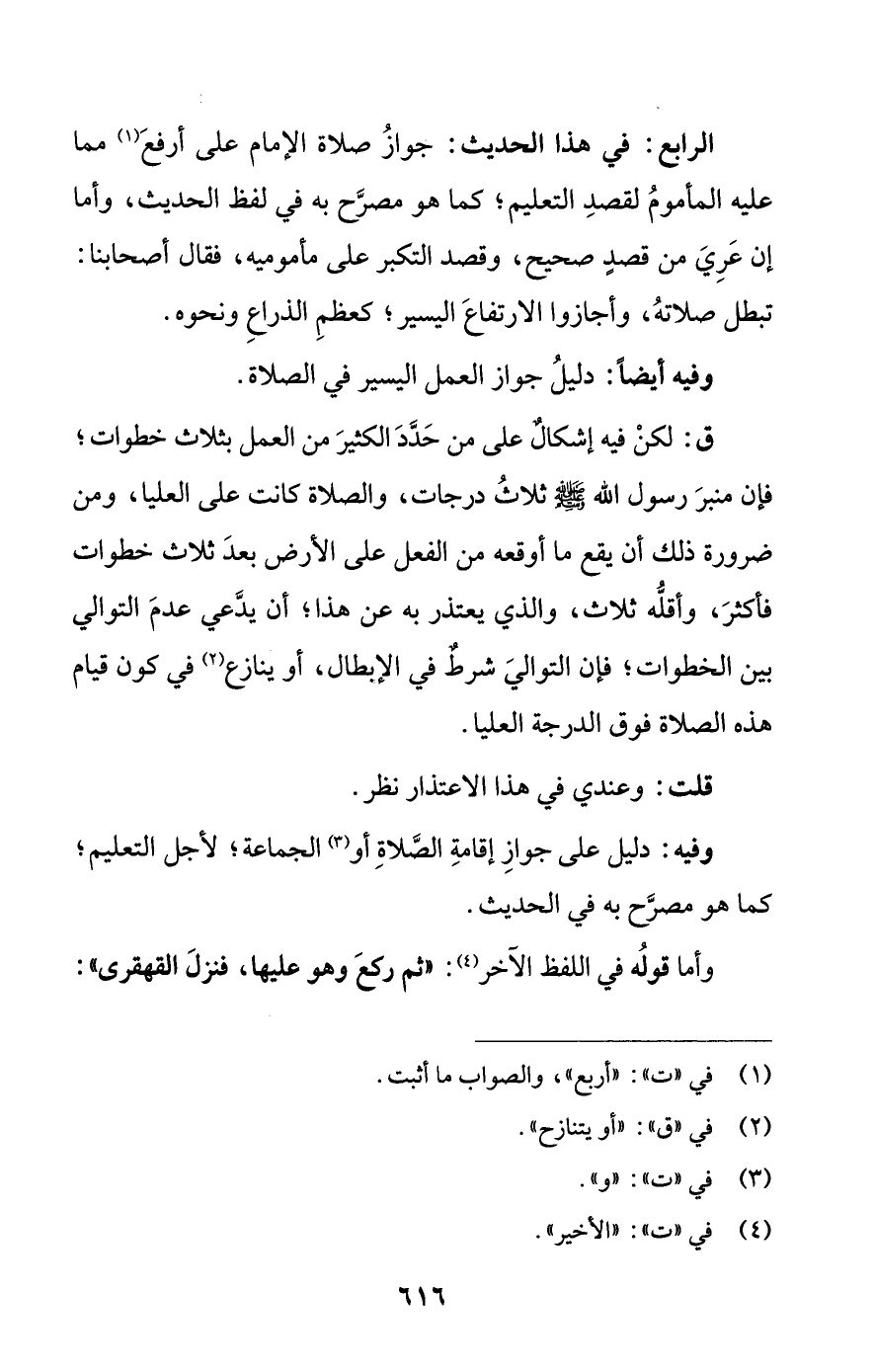 ق: لكنْ فيه إشكالٌ على من حَدَّدَ الكثيرَ من العمل بثلاث خطوات؛ فإن منبرَ رسول اللَّه -صلى اللَّه عليه وسلم- ثلاثُ درجات، والصلاة كانت على العليا، ومن ضرورة ذلك أن يقع ما أوقعه من الفعل على الأرض بعدَ ثلاث خطوات فأكثرَ، وأقلُّه ثلاث، والذي يعتذر به عن هذا؛ أن يدَّعي عدمَ التوالي بين الخطوات؛ فإن التواليَ شرطٌ في الإبطال، أو ينازع (¬2) في كون قيام هذه الصلاة فوق الدرجة العليا.