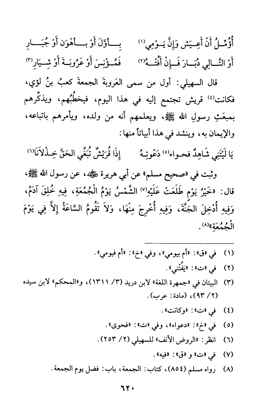قال السهيلي: أول من سمى العَروبةَ الجمعةَ كعبُ بنُ لؤي، فكانت (¬4) قريش تجتمع إليه في هذا اليوم، فيخطُبُهم، ويذكِّرهم بمبعَثِ رسولِ اللَّه -صلى اللَّه عليه وسلم-، ويعلمهم أنه من ولده، ويأمرهم باتباعه، والإيمان به، وينشد في هذا أبياتًا منها:
