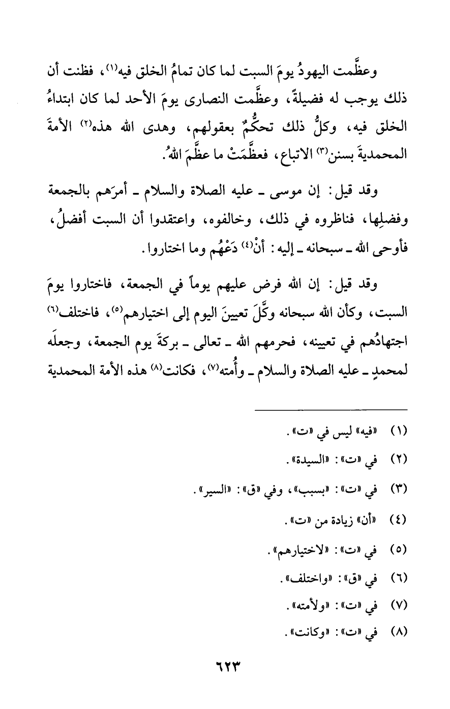 وعظَّمت اليهودُ يومَ السبت لما كان تمامُ الخلق فيه (¬1)، فظنت أن ذلك يوجب له فضيلةً، وعظَّمت النصارى يومَ الأحد لما كان ابتداءُ الخلق فيه، وكلُّ ذلك تحكُّمٌ بعقولهم، وهدى اللَّه هذه (¬2) الأمةَ المحمديةَ بسنن (¬3) الاتباع، فعظَّمَتْ ما عظَّمَ اللَّهُ.