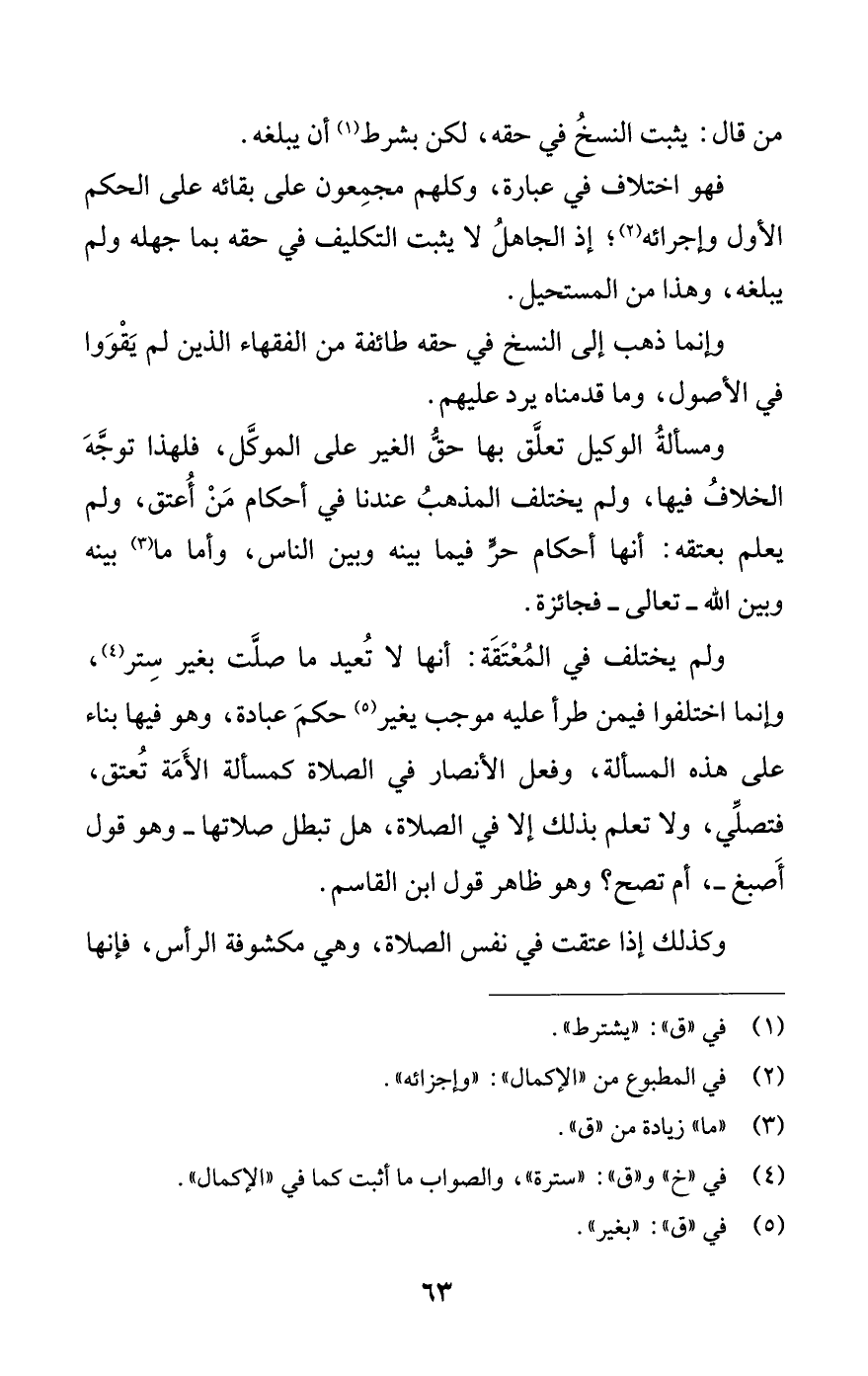 ولم يختلف في المعتقة: أنها لا تعيد ما صلت بغير ستر (¬4)، وإنما اختلفوا فيمن طرأ عليه مموجب يغير (¬5) حكم عبادة، وهو فيها بناء على هذه المسألة، وفعل الأنصار في الصلاة كمسألة الأمة تعتق، فتصلي، ولا تعلم بذلك إلا في الصلاة، هل تبطل صلاتها -وهو قول أصبغ-، أم تصح؟ وهو ظاهر قول ابن القاسم.