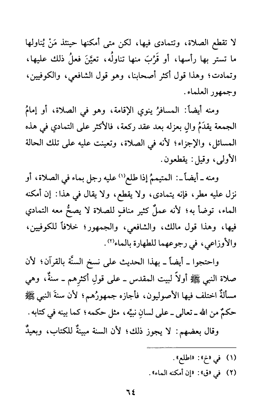 ومنها أيضا: المسافر ينوي الإقامة، وهو في الصلاة، أو إمام الجمعة يقدُمُ وال بعزله بعد عقد ركعة، فالأكثر على التمادي في هذه المسائل، والإجزاء؛ لأنه في الصلاة، وتعينت عليه على تلك الحالة الأولى، وقل: يقطعون.