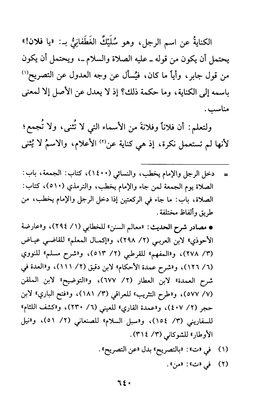 الكنايةُ عن اسم الرجل، وهو سُلَيْكٌ الغَطَفانِيُّ بـ: "يا فلان! " يحتمل أن يكون من قوله -عليه الصلاة والسلام-، ويحتمل أن يكون من قول جابر، وأيًا ما كان، فيُسأل عن وجه العدول عن التصريح (¬1) باسمه إلى الكناية، وما حكمة ذلك؟ إذ لا يعدل عن الأصل إِلَّا لمعنى مناسب.
