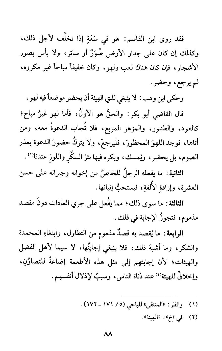 الرابعة: ما يقصد به قصد مذموم من التطاول، وابتغاء المحمدة والشكر، وما أشبه ذلك، فلا ينبغي إجابتها، لا سيما لأهل الفضل والهيئات؛ لأن إجابتهم إلى مثل هذه الأطعمة إضاعة للتصاون، وإخلاق للهيئة ت (¬2) عند دناة الناس، وسببب لإذلال أنفسهم.