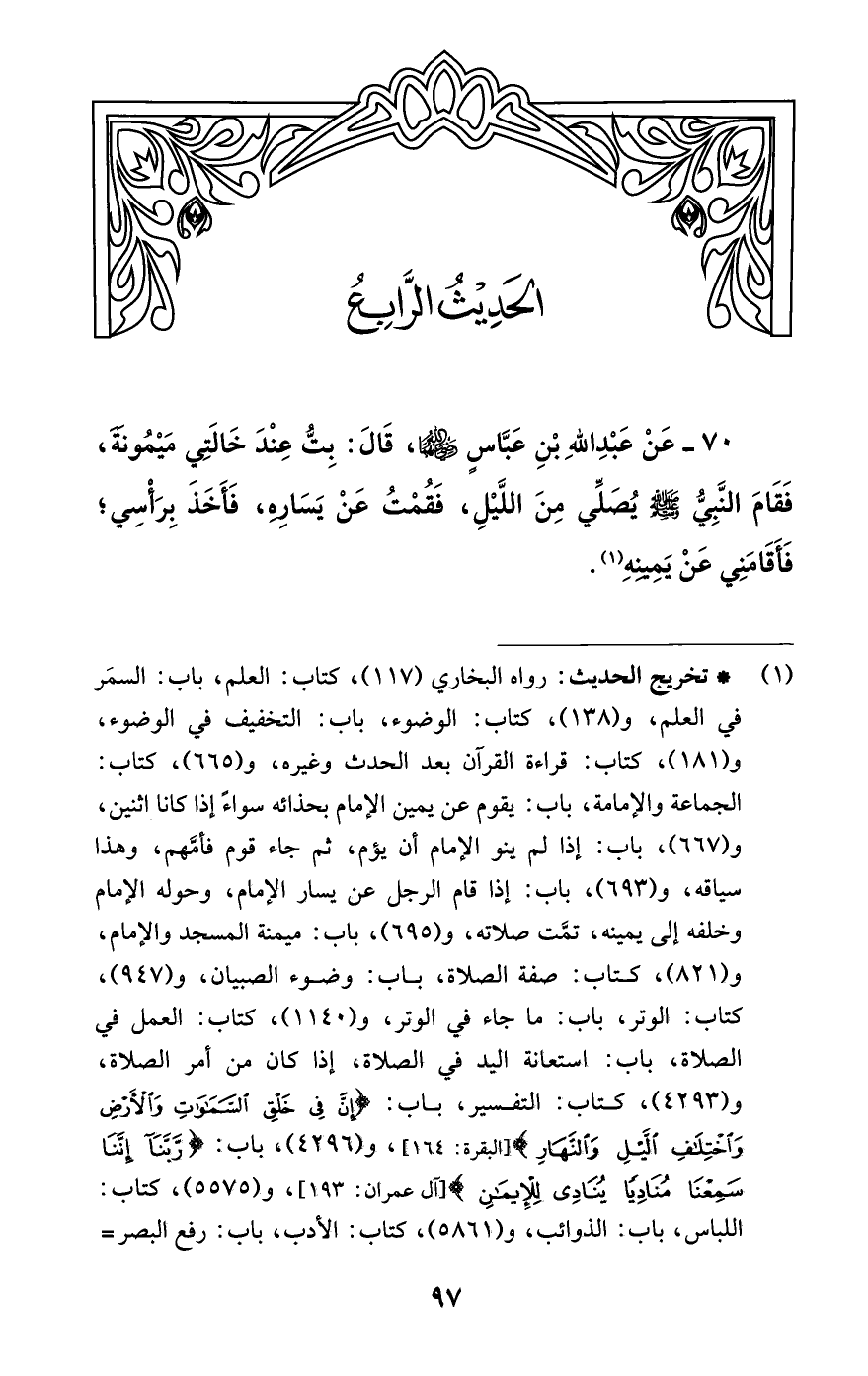 70 - عَنْ عَبْدِ اللَّهِ بْنِ عَبَّاسٍ رضي الله عنهما، قَالَ: بِتُّ عِنْدَ خَالَتِي مَيْمُونَةَ، فَقَامَ النَّبِيُّ - صلى الله عليه وسلم - يُصَلِّي مِنْ اللَّيْلِ، فَقُمْتُ عَنْ يَسَارِهِ، فَأَخَذَ بِرَأْسِي؛ فَأَقَامَنِي عَنْ يَمِينِهِ (¬1).