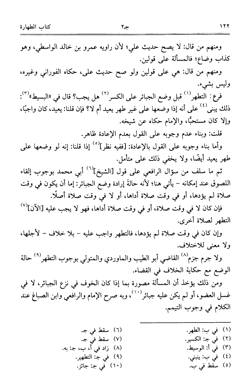 فرع: التطهر قبل وضع الجبائر على الكسر هل يجب؟ قال في "البسيط": ذلك يبني على أنه إذا وضعها على غير طهر يعيد أم لا؟ فإن قلنا: يعيد، كان واجباً، وإلا كان مستحباً، والإمام حكاه عن شيخه.