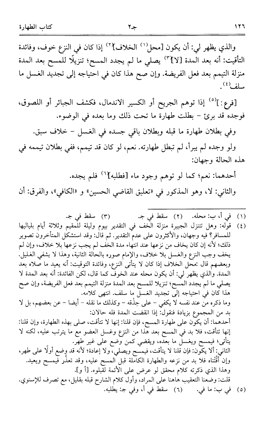 والذي يظهر لي: أن يكون [محل الخلاف] إذا كان في النزع خوف، وفائدة التأقيت: أنه بعد المدة [لا] يصلي ما لم يجدد المسح؛ تنزيلاً للمسح بعد المدة منزلة التيمم بعد فعل الفريضة. وإن صح هذا كان في احتياجه إلى تجديد الغسل ما سلف.