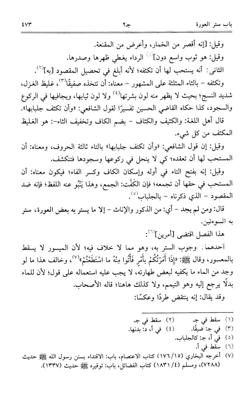 وقيل: إن قول الشافعي: "وأن تكتف جلبابها" بالتاء ثالثة الحروف، ومعناه: أن المستحب لها أن تعقده؛ كي لا ينحل في ركوعها وسجودها فتنكشف.
