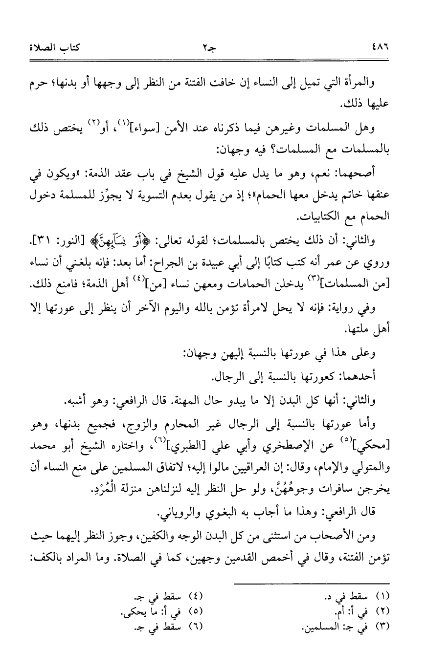 والثاني: أن ذلك يختص بالمسلمات؛ لقوله تعالى: {أَوْ نِسَائِهِنَّ} [النور: 31]. وروي عن عمر أنه كتب كتاباً إلى أبي عبيدة بن الجراح: أما بعد: فإنه بلغني أن نساء [من المسلمات] يدخلن الحمامات ومعهن نساء [من] أهل الذمة؛ فامنع ذلك.