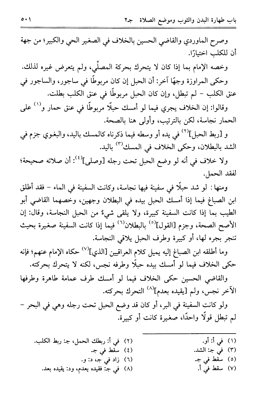 ومنها: لو شد حبلاً في سفينة فيها نجاسة، وكانت السفينة في الماء- فقد أطلق ابن الصباغ فيما إذا أمسك الحبل بيده في البطلان وجهين، وخصهما القاضي أبو الطيب بما إذا كانت السفينة كبيرة، ولا يلقى شيءٌ من الحبل النجاسة، وقال: إن الأصح الصحة، وجزم [القول] بالبطلان فيما إذا كانت السفينة صغيرة بحيث تنجز بجره لها، أو كبيرة وطرف الحبل يلاقي النجاسة.