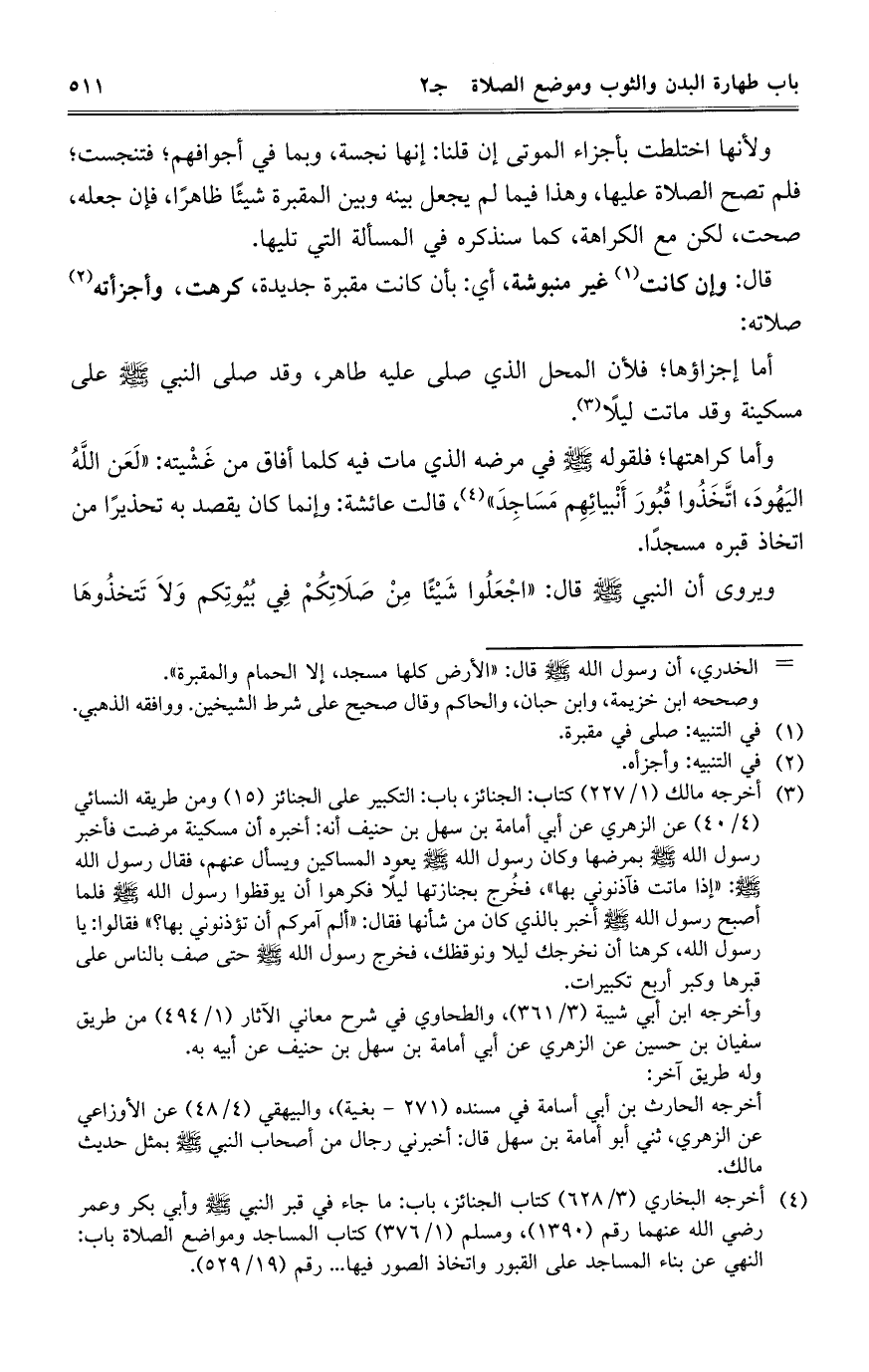 وأما كراهتها؛ فلقوله صلى الله عليه وسلم في مرضه الذي مات فيه كلما أفاق من غَشْيته: "لَعَنَ اللهُ اليَهُودَ، اتَّخَذُوا قُبُورَ أَنْبيائِهِم مَسَاجِدَ"، قالت عائشة: وإنما كان يقصد به تحذيراً من اتخاذ قبره مسجداً.