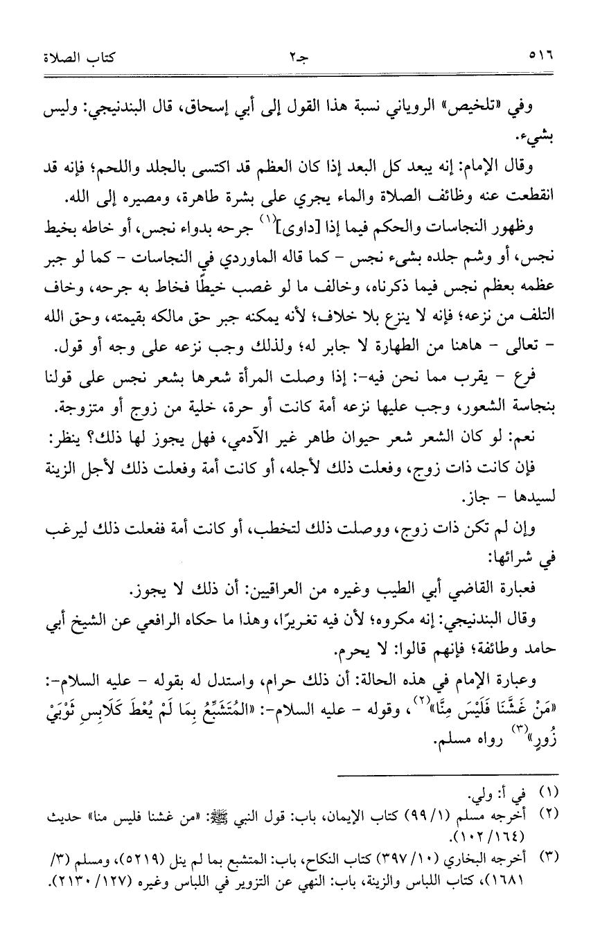 وقال الإمام: إنه يبعد كل البعد إذا كان العظم قد اكتسى بالجلد واللحم؛ فإنه قد انقطعت عنه وظائف الصلاة والماء يجري على بشرة طاهرة، ومصيره إلى الله.
