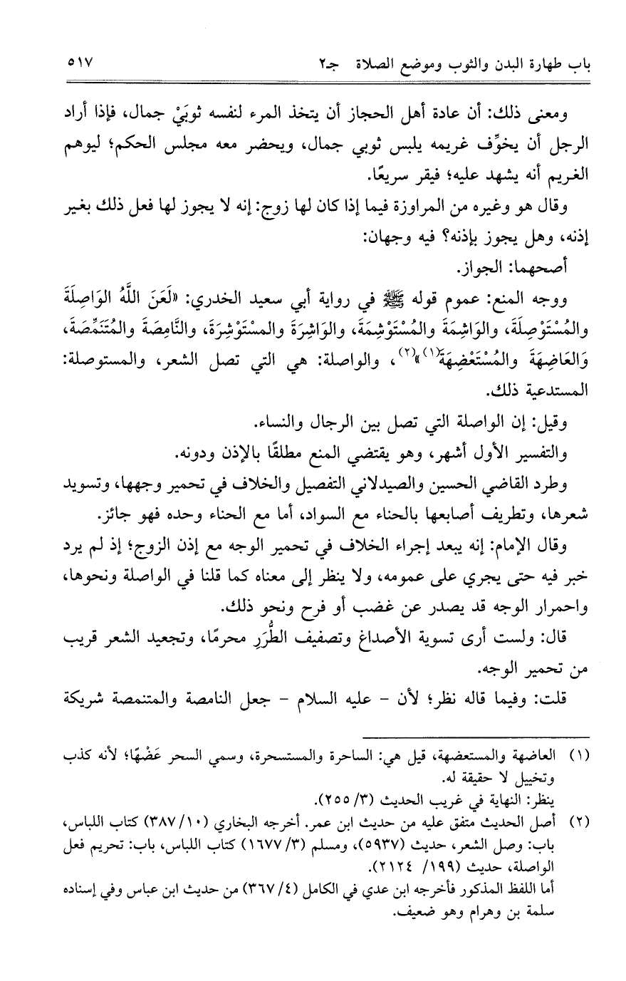 وقال الإمام: إنه يبعد إجراء الخلاف في تحمير الوجه مع إذن الزوج؛ إذ لم يرد خبر فيه حتى يجري على عمومه، ولا ينظر إلى معناه كما قلنا في الواصلة ونحوها، واحمرار الوجه قد يصدر عن غضب أو فرح ونحو ذلك.