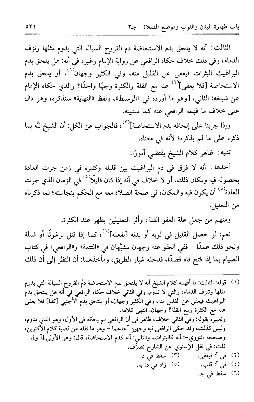 الثالث: أنه لا يلحق بدم الاستحاضة دم القروح السيالة التي يدوم مثلها ونزف الدماء، وفي ذلك خلاف حكاه الرافعي عن رواية الإمام وغيره في أنه: هل يلحق بدم البراغيث البثرات فيعفى عن القليل منه، وفي الكثير وجهان، أو يلحق بدم الاستحاضة [فلا يعفى] عنه مع القلة والكثرة وجهاً واحداً؟ والذي حكاه الإمام عن شيخه: الثاني، [وهو ما أورده في "الوسيط"، ولفظ "النهاية" سنذكره، وهو دال على خلاف ما فهمه الرافعي عنه كما سنبينه.