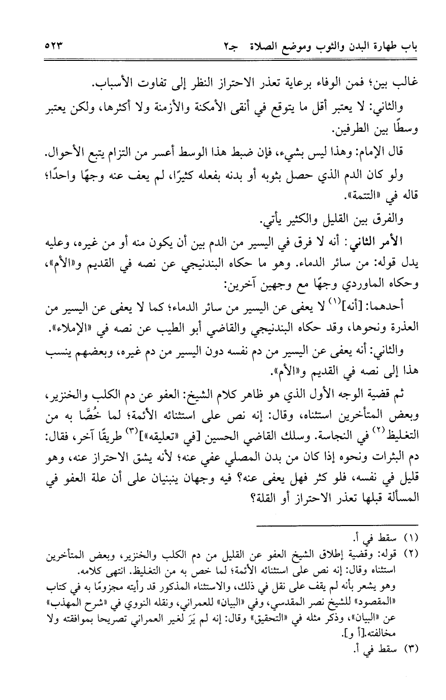 ثم قضية الوجه الأول الذي هو ظاهر كلام الشيخ: العفو عن دم الكلب والخنزير، وبعض المتأخرين استثناه، وقال: إنه نص على استثنائه الأئمة؛ لما خُصَّا به من التغليظ في النجاسة. وسلك القاضي الحسين [في "تعليقه"] طريقاً آخر، فقال: دم البثرات ونحوه إذا كان من بدن المصلي عفي عنه؛ لأنه يشق الاحتراز عنه، وهو قليل في نفسه، فلو كثر فهل يعفى عنه؟ فيه وجهان ينبنيان على أن علة العفو في المسألة قبلها تعذر الاحتراز أو القلة؟