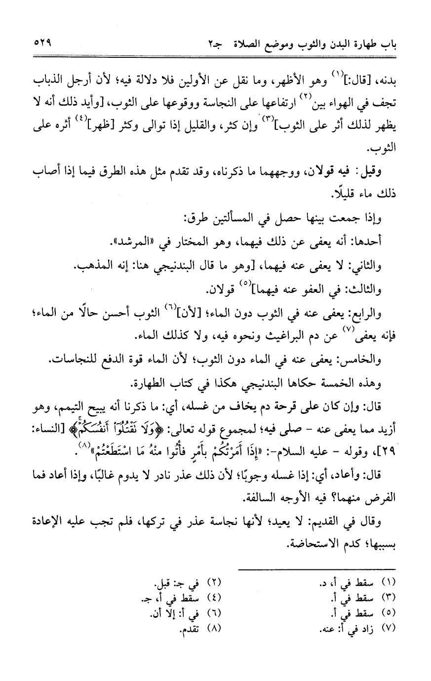 بدنه، [قال:] وهو الأظهر، وما نقل عن الأولين فلا دلالة فيه؛ لأن أرجل الذباب تجف في الهواء بين ارتفاعها على النجاسة ووقوعها على الثوب، [وأيد ذلك أنه لا يظهر لذلك أثر على الثوب] وإن كثر، والقليل إذا توالى وكثر [ظهر] أثره على الثوب.