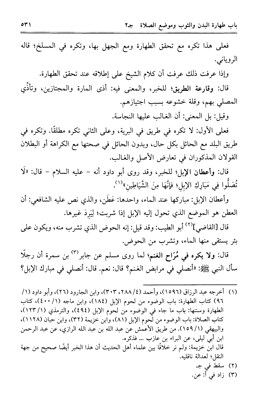 قال: وأعطان الإبل؛ للخبر، وقد روى أبو داود أنه- عليه السلام- قال: "لَا تُصَلُّوا فِي مَبَارِكِ الإِبِلِ؛ فإنَّهَا مِنَ الشَّيَاطِينِ".