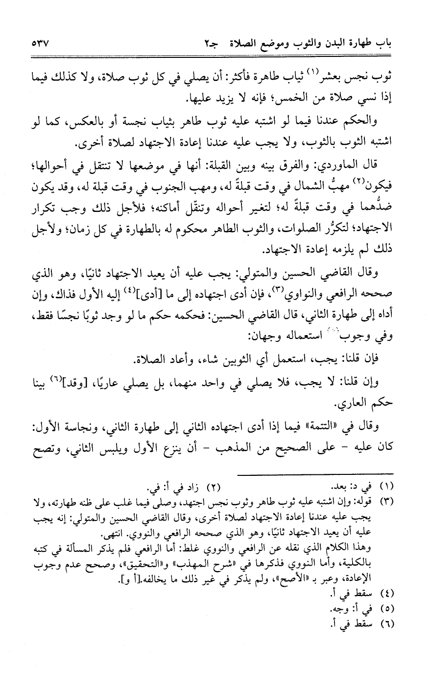 وقال القاضي الحسين والمتولي: يجب عليه أن يعيد الاجتهاد ثانياً، وهو الذي صححه الرافعي والنواوي، فإن أدى اجتهاد إلى ما [أدى] إليه الأول فذاك، وإن أداه إلى طهارة الثاني، قال القاضي الحسين: فحكه حكم ما لو وجد ثوباً نجساً فقط، وفي وجوب استعماله وجهان:
