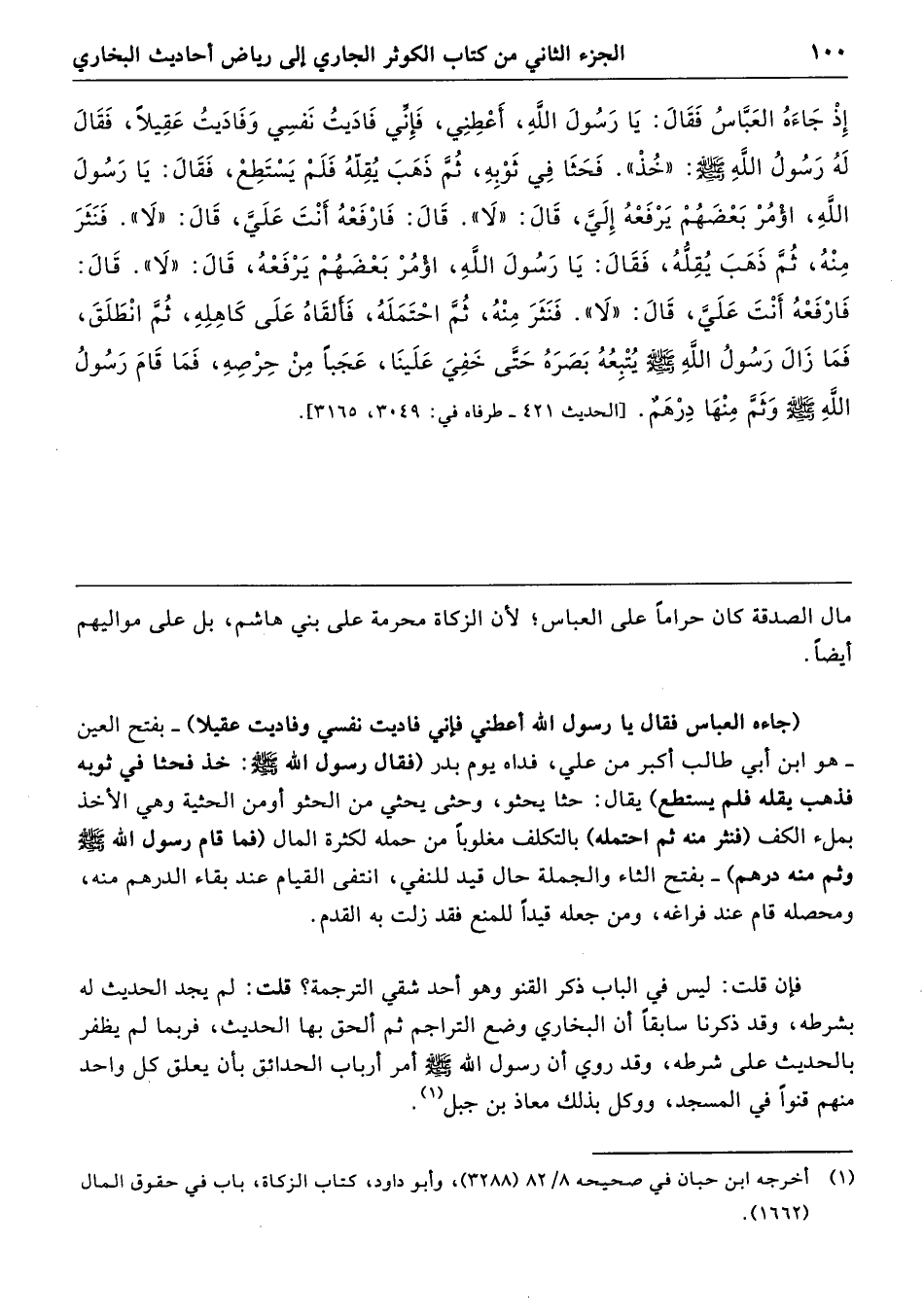 إِذْ جَاءَهُ الْعَبَّاسُ فَقَالَ يَا رَسُولَ اللَّهِ، أَعْطِنِى فَإِنِّى فَادَيْتُ نَفْسِى وَفَادَيْتُ عَقِيلاً، فَقَالَ لَهُ رَسُولُ اللَّهِ - صلى الله عليه وسلم - «خُذْ». فَحَثَا فِي ثَوْبِهِ، ثُمَّ ذَهَبَ يُقِلُّهُ فَلَمْ يَسْتَطِعْ فَقَالَ يَا رَسُولَ اللَّهِ، أُؤْمُرْ بَعْضَهُمْ يَرْفَعُهُ إِلَىَّ. قَالَ «لاَ». قَالَ فَارْفَعْهُ أَنْتَ عَلَىَّ. قَالَ «لاَ». فَنَثَرَ مِنْهُ، ثُمَّ ذَهَبَ يُقِلُّهُ، فَقَالَ يَا رَسُولَ اللَّهِ، أُؤْمُرْ بَعْضَهُمْ يَرْفَعْهُ عَلَىَّ. قَالَ «لاَ». قَالَ فَارْفَعْهُ أَنْتَ عَلَىَّ. قَالَ «لاَ». فَنَثَرَ مِنْهُ، ثُمَّ احْتَمَلَهُ فَأَلْقَاهُ عَلَى كَاهِلِهِ ثُمَّ انْطَلَقَ، فَمَا زَالَ رَسُولُ اللَّهِ - صلى الله عليه وسلم - يُتْبِعُهُ بَصَرَهُ حَتَّى خَفِىَ عَلَيْنَا، عَجَبًا مِنْ حِرْصِهِ، فَمَا قَامَ رَسُولُ اللَّهِ - صلى الله عليه وسلم - وَثَمَّ مِنْهَا دِرْهَمٌ. طرفاه 3049، 3165