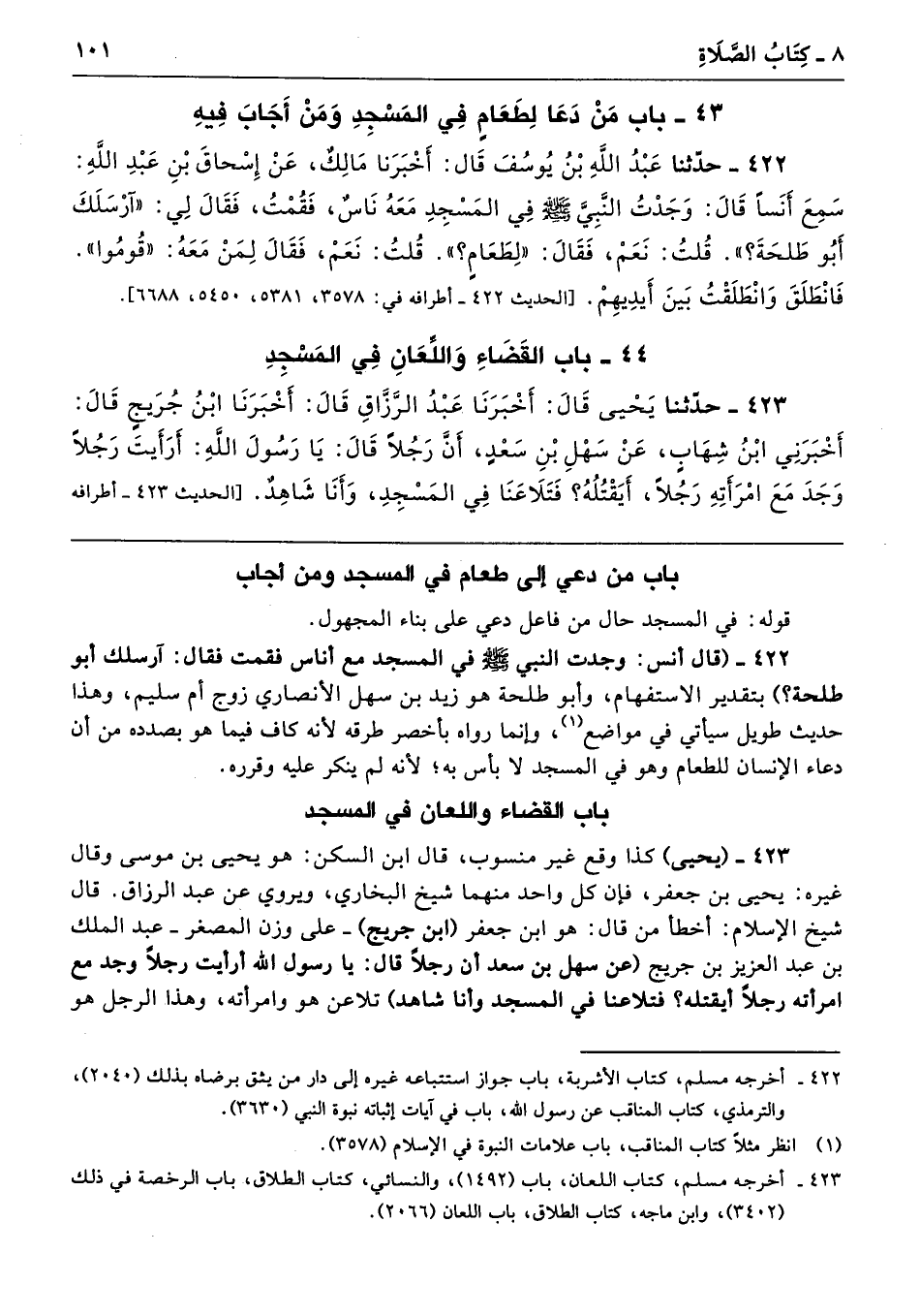 422 - (قال أنس: وجدت النبي - صلى الله عليه وسلم - في المسجد مع أناس فقمت فقال: آرسلك أبو طلحة؟) بتقدير الاستفهام، وأبو طلحة هو زيد بن سهل الأنصاري زوج أم سليم، وهذا حديث طويل سيأتي في مواضع، وإنما رواه بأخصر طرقه لأنه كاف فيما هو بصدده من أن دعاء الإنسان للطعام وهو في المسجد لا بأس به؛ لأنه لم ينكر عليه وقرره.