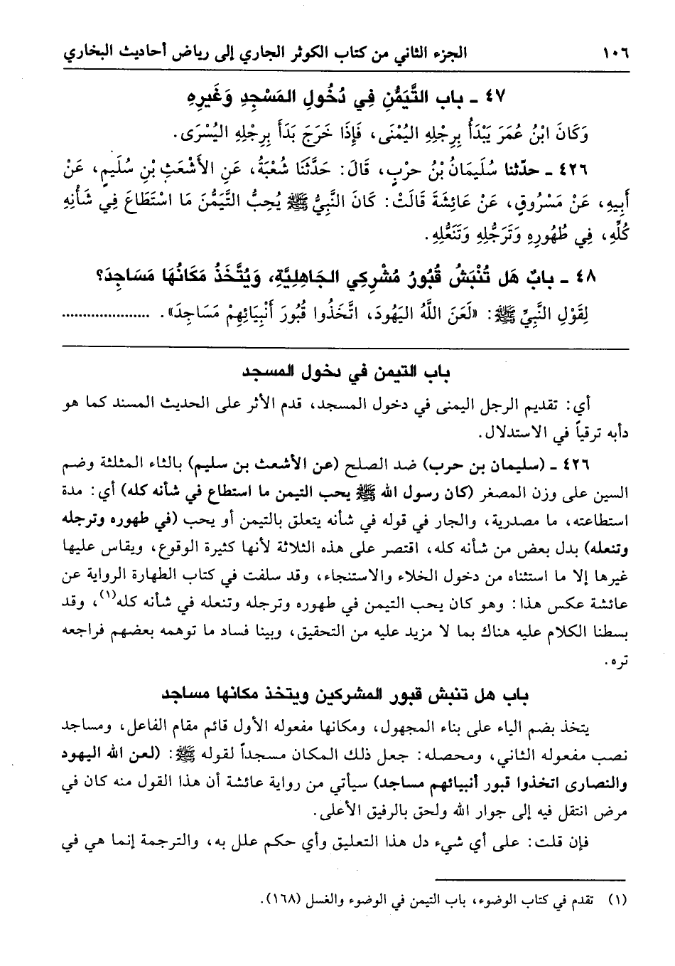 426 - (سليمان بن حرب) ضد الصلح (عن الأشعث بن سليم) بالثاء المثلثة وضم السين على وزن المصغر كان رسول الله - صلى الله عليه وسلم - يحب التيمن ما استطاع في شأنه كله) أي: مدة استطاعته، ما مصدرية، والجار في قوله في شأنه يتعلق بالتيمن أو يحب (في طهوره وترجله وتنعله) بدل بعض من شأنه كله، اقتصر على هذه الثلاثة لأنها كثيرة الوقوع، ويقاس عليها غيرها إلا ما استثناه من دخول الخلاء والاستنجاء، وقد سلفت في كتاب الطهارة الرواية عن عائشة عكس هذا: وهو كان يحب التيمن في طهوره وترجله وتنعله في شأنه كله، وقد بسطنا الكلام عليه هناك بما لا مزيد عليه من التحقيق، وبينا فساد ما توهمه بعضهم فراجعه تره.