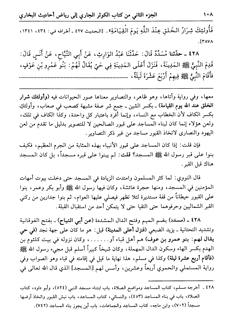 428 - (مسدد) بضم الميم وفتح الدال المشددة (عن أبي التياح) -بفتح الفوقانية وتشديد التحتانية- يزيد الضبعي (فنزل أعلى المدينة) قيل: هو ما كان على جهة نجد (في حي يقال لهم: بنو عمرو بن عوف) هم أهل قباء أو ...... ، وكان نزوله في بيت كلثوم بن الهدم بكسر الهاء وسكون الدال المهملة، وكان شيخًا كبيرًا أسلم قبل مجيء رسول الله - صلى الله عليه وسلم - (فأقام أربع عشرة ليلة) وكذا في مسلم، هذا نهاية ما قيل في إقامته في قباء وهو الصواب وفي رواية المستملي والحموي أربعًا وعشرين، وأسس لهم [المسجد، الذي قال الله تعالى في