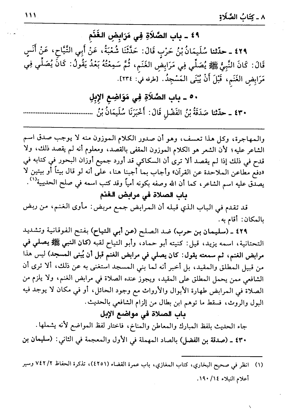 429 - حَدَّثَنَا سُلَيْمَانُ بْنُ حَرْبٍ قَالَ حَدَّثَنَا شُعْبَةُ عَنْ أَبِى التَّيَّاحِ عَنْ أَنَسٍ قَالَ كَانَ النَّبِىُّ - صلى الله عليه وسلم - يُصَلِّى فِي مَرَابِضِ الْغَنَمِ، ثُمَّ سَمِعْتُهُ بَعْدُ يَقُولُ كَانَ يُصَلِّى فِي مَرَابِضِ الْغَنَمِ قَبْلَ أَنْ يُبْنَى الْمَسْجِدُ. طرفه 234