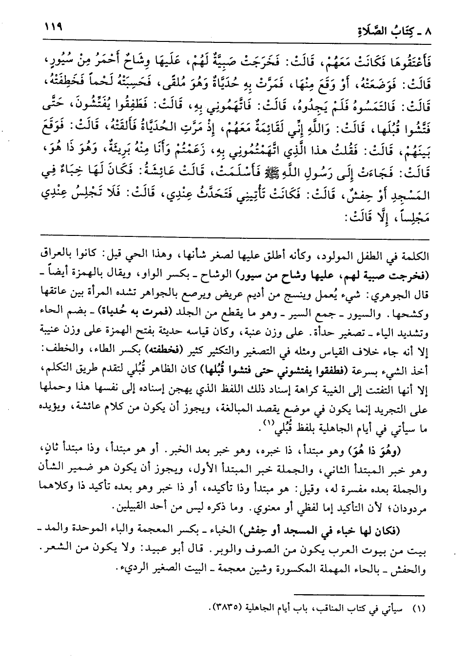الكلمة في الطفل المولود، وكأنه أطلق عليها لصغر شأنها، وهذا الحي قيل: كانوا بالعراق (فخرجت صبية لهم، عليها وشاح من سيور) الوشاح -بكسر الواو، ويقال بالهمزة أيضًا- قال الجوهري: شيء يُعمل وينسج من أديم عريض ويرصع بالجواهر تشده المرأة بين عاتقها وكشحها. والسيور -جمع السير- وهو ما يقطع من الجلد (فمرت به حُدياة) -بضم الحاء وتشديد الياء- تصغير حدأة. على وزن عنبة، وكان قياسه حديئة بفتح الهمزة على وزن عنيبة إلا أنه جاء خلاف القياس ومثله في التصغير والتكثير كثير (فخطفته) بكسر الطاء، والخطف: أخذ الشيء بسرعة (فطفقوا يفثشوني حتى فتشوا قُبُلها) كان الظاهر قُبُلي لتقدم طريق التكلم، إلا أنها التفتت إلى الغيبة كراهة إسناد ذلك اللفظ الذي يهجن إسناده إلى نفسها هذا وحملها على التجريد إنما يكون في موضع يقصد المبالغة، ويجوز أن يكون من كلام عائشة، ويؤيده ما سيأتي في أيام الجاهلية بلفظ قُبُلي.