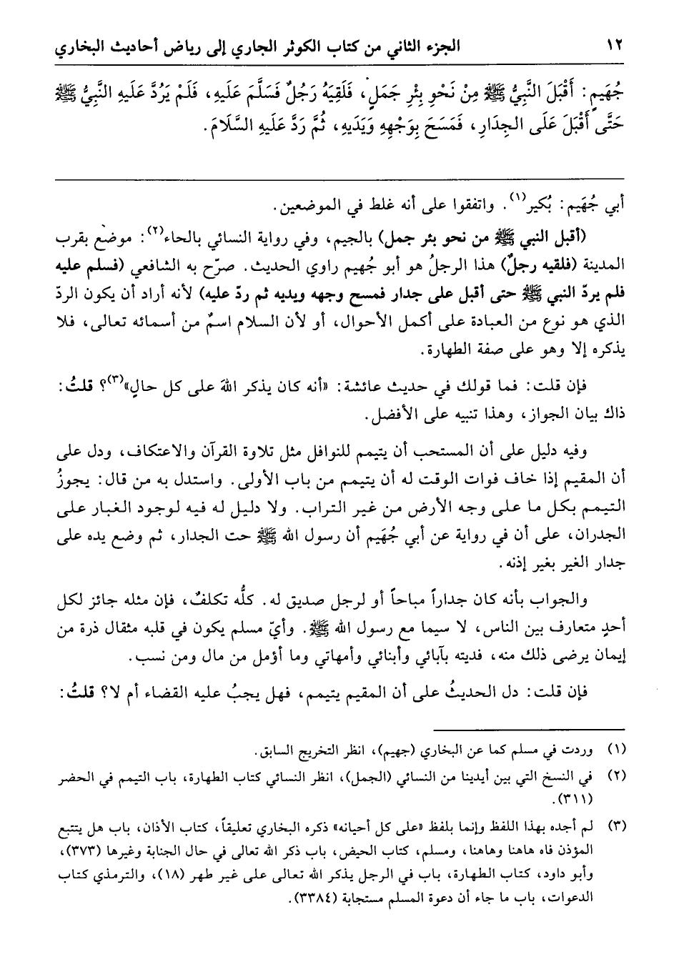 الْجُهَيْمِ أَقْبَلَ النَّبِىُّ - صلى الله عليه وسلم - مِنْ نَحْوِ بِئْرِ جَمَلٍ، فَلَقِيَهُ رَجُلٌ فَسَلَّمَ عَلَيْهِ، فَلَمْ يَرُدَّ عَلَيْهِ النَّبِىُّ - صلى الله عليه وسلم - حَتَّى أَقْبَلَ عَلَى الْجِدَارِ، فَمَسَحَ بِوَجْهِهِ وَيَدَيْهِ، ثُمَّ رَدَّ عَلَيْهِ السَّلاَمَ.