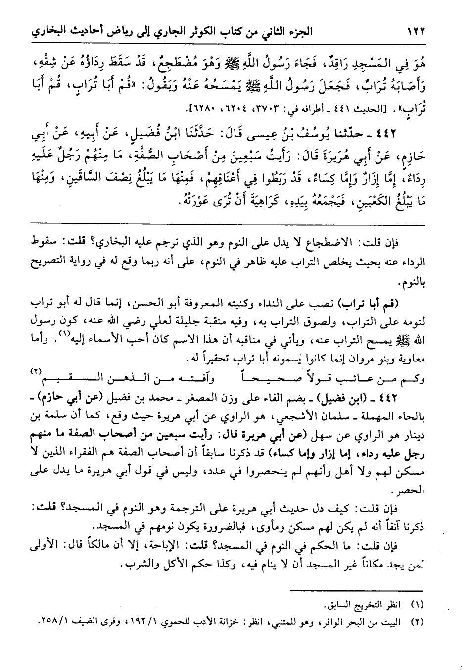 442 - (ابن فضيل) -بضم الفاء على وزن المصغر- محمد بن فضيل (عن أبي حازم) -بالحاء المهملة- سلمان الأشجعي، هو الراوي عن أبي هريرة حيث وقع، كما أن سلمة بن دينار هو الراوي عن سهل (عن أبي هريرة قال: رأيت سبعين من أصحاب الصفة ما منهم رجل عليه رداء، إما إزار واما كساء) قد ذكرنا سابقًا أن أصحاب الصفة هم الفقراء الذين لا مسكن لهم ولا أهل وأنهم لم ينحصروا في عدد، وليس في قول أبي هريرة ما يدل على الحصر.