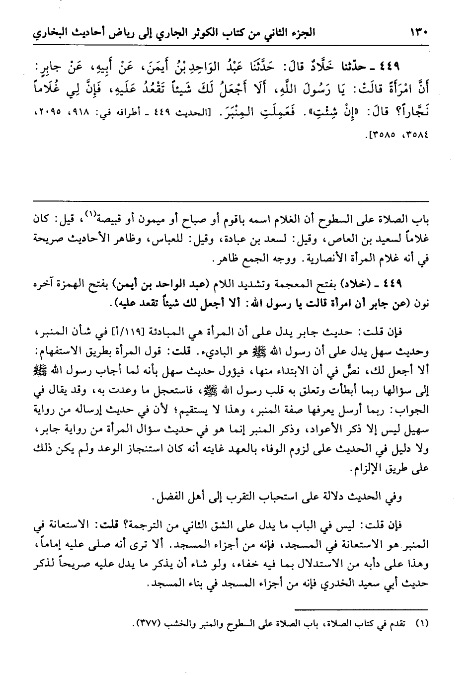 449 - (خلاد) بفتح المعجمة وتشديد اللام (عبد الواحد بن أيمن) بفتح الهمزة آخره نون (عن جابر أن امرأة قالت يا رسول الله: ألا أجعل لك شيئًا تقعد عليه).