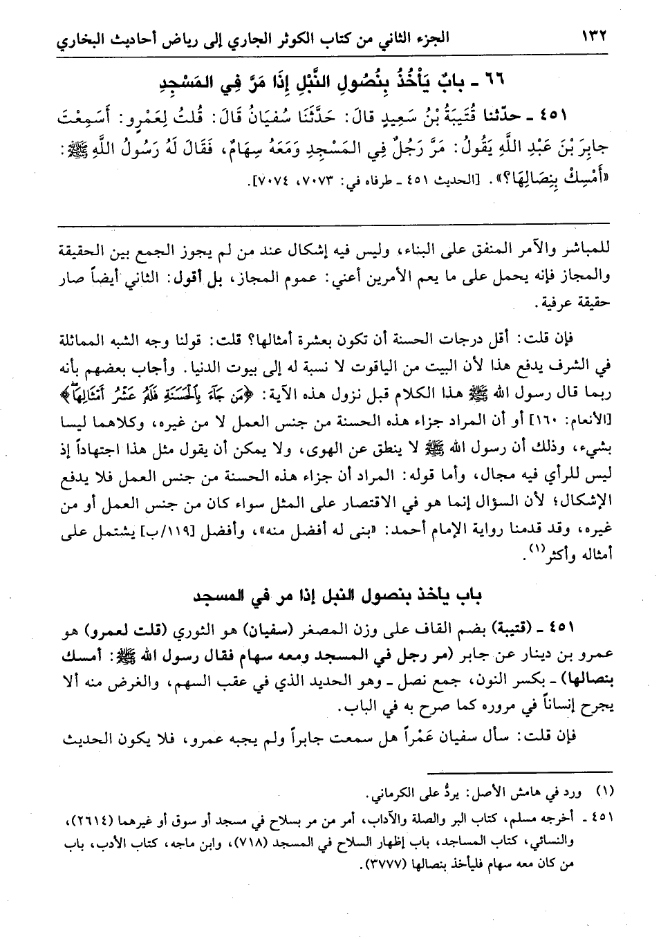 451 - (قتيبة) بضم القاف على وزن المصغر (سفيان) هو الثوري (قلت لعمرو) هو عمرو بن دينار عن جابر (مر رجل في المسجد ومعه سهام فقال رسول الله - صلى الله عليه وسلم -: أمسك بنصالها) -بكسر النون، جمع نصل- وهو الحديد الذي في عقب السهم، والغرض منه ألا يجرح إنسانًا في مروره كما صرح به في الباب.