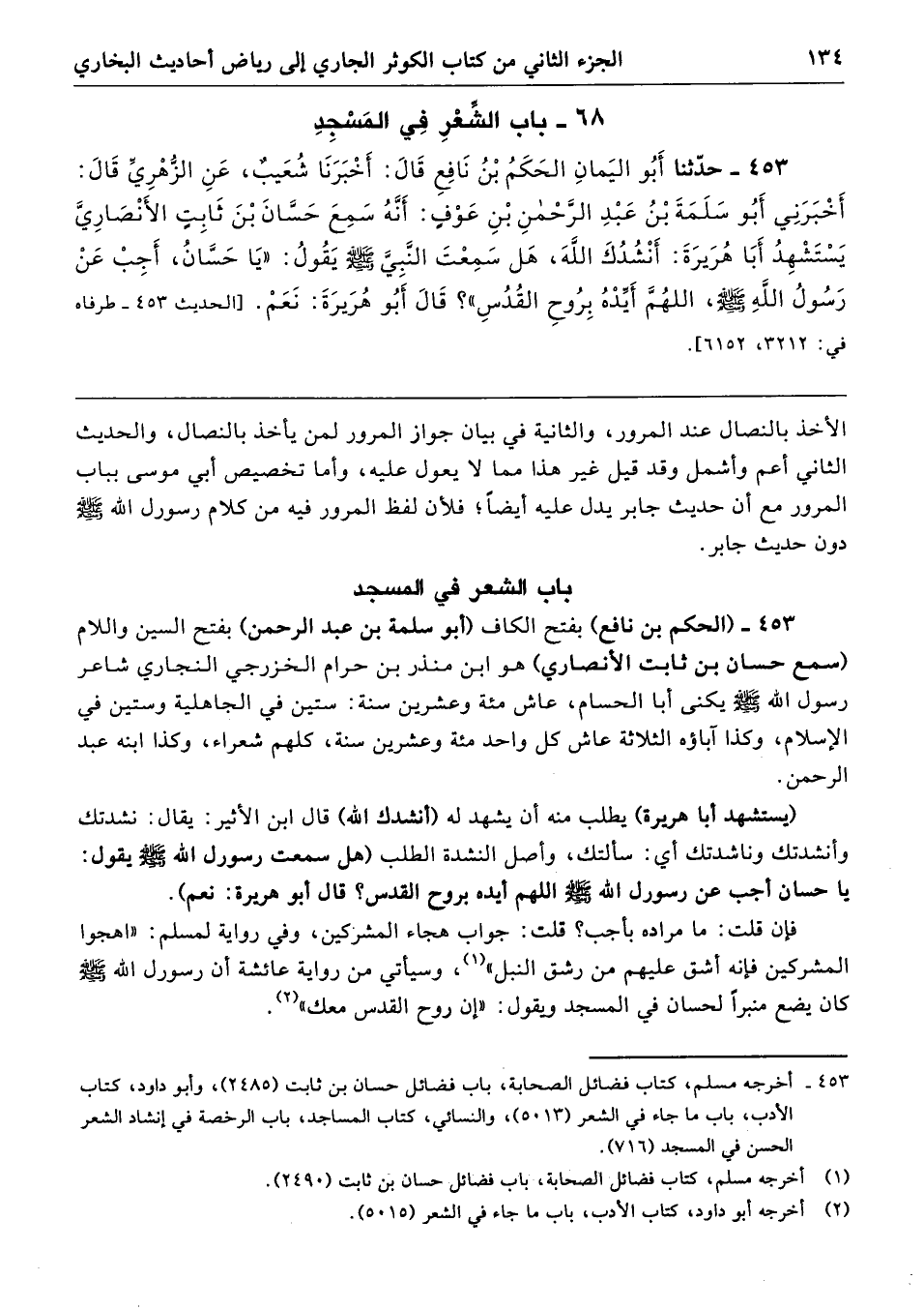 453 - (الحكم بن نافع) بفتح الكاف (أبو سلمة بن عبد الرحمن) بفتح السين واللام (سمع حسان بن ثابت الأنصاري) هو ابن منذر بن حرام الخزرجي النجاري شاعر رسول الله - صلى الله عليه وسلم - يكنى أبا الحسام، عاش مئة وعشرين سنة: ستين في الجاهلية وستين في الإسلام، وكذا آباؤه الثلاثة عاش كل واحد مئة وعشرين سنة، كلهم شعراء، وكذا ابنه عبد الرحمن.