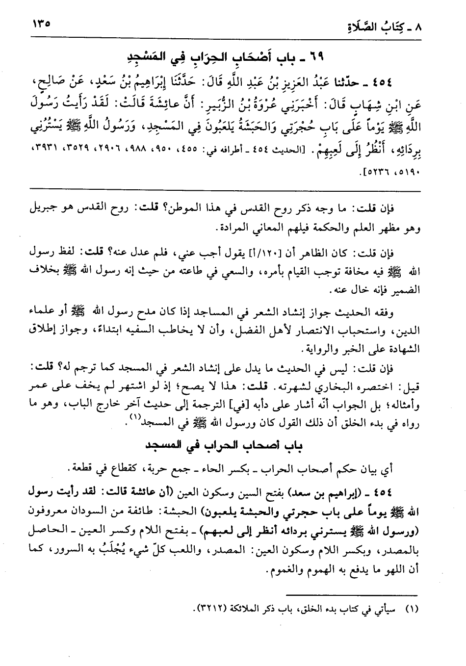 454 - (إبراهيم بن سعد) بفتح السين وسكون العين (أن عائشة قالت: لقد رأيت رسول الله - صلى الله عليه وسلم - يومًا على باب حجرتي والحبشة يلعبون) الحبشة: طائفة من السودان معروفون (ورسول الله - صلى الله عليه وسلم - يسترني بردائه أنظر إلى لعبهم) -بفتح اللام وكسر العين- الحاصل بالمصدر، وبكسر اللام وسكون العين: المصدر، واللعب كل شيء يُجْلَبُ به السرور، كما أن اللهو ما يدفع به الهموم والغموم.