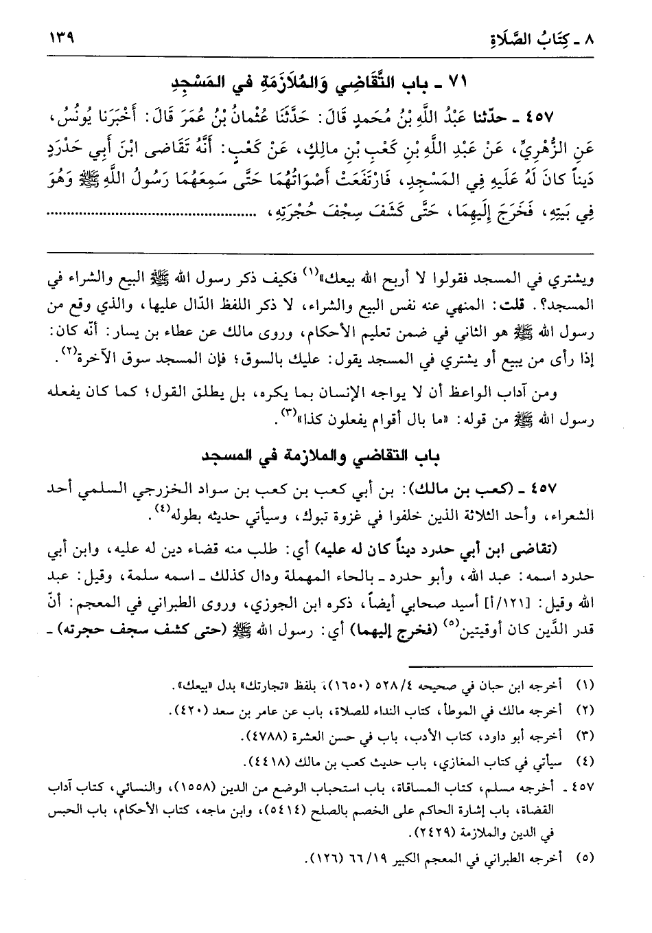 457 - حَدَّثَنَا عَبْدُ اللَّهِ بْنُ مُحَمَّدٍ قَالَ حَدَّثَنَا عُثْمَانُ بْنُ عُمَرَ قَالَ أَخْبَرَنَا يُونُسُ عَنِ الزُّهْرِىِّ عَنْ عَبْدِ اللَّهِ بْنِ كَعْبِ بْنِ مَالِكٍ عَنْ كَعْبٍ أَنَّهُ تَقَاضَى ابْنَ أَبِى حَدْرَدٍ دَيْنًا كَانَ لَهُ عَلَيْهِ فِي الْمَسْجِدِ، فَارْتَفَعَتْ أَصْوَاتُهُمَا حَتَّى سَمِعَهَا رَسُولُ اللَّهِ - صلى الله عليه وسلم - وَهْوَ فِي بَيْتِهِ، فَخَرَجَ إِلَيْهِمَا حَتَّى كَشَفَ سِجْفَ حُجْرَتِهِ