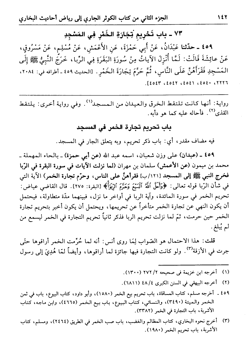 459 - (عبدان) على وزن شعبان، اسمه عبد الله (عن أبي حمزة) -بالحاء المهملة- محمد بن ميمون (عن الأعمثس) سلمان بن مهران (لما نزلت الآيات في سورة البقرة في الرّبا فخرج النبي - صلى الله عليه وسلم - إلى المسجد فقرأهنَّ على الناس، وحرّم تجارة الخمر) الآية التي في شأن الرّبا قوله تعالى: {وَأَحَلَّ اللَّهُ الْبَيْعَ وَحَرَّمَ الرِّبَا} [البقرة: 275]. قال القاضي عياض: تحريم الخمر في سورة المائدة، وآية الربا في أواخر ما نزل، فبينهما مدّة متطاولة، فيحتمل أن يكون النهي عن تجارة الخمر متأخرًا عن تحريمها، ويحتمل أن يكون أخبر بتحريم تجارة الخمر حين حرمت، ثمّ لما نزلت تحريم الربا فذكر ثانيًا تحريم التجارة في الخمر ليسمع من لم يُبلغ.