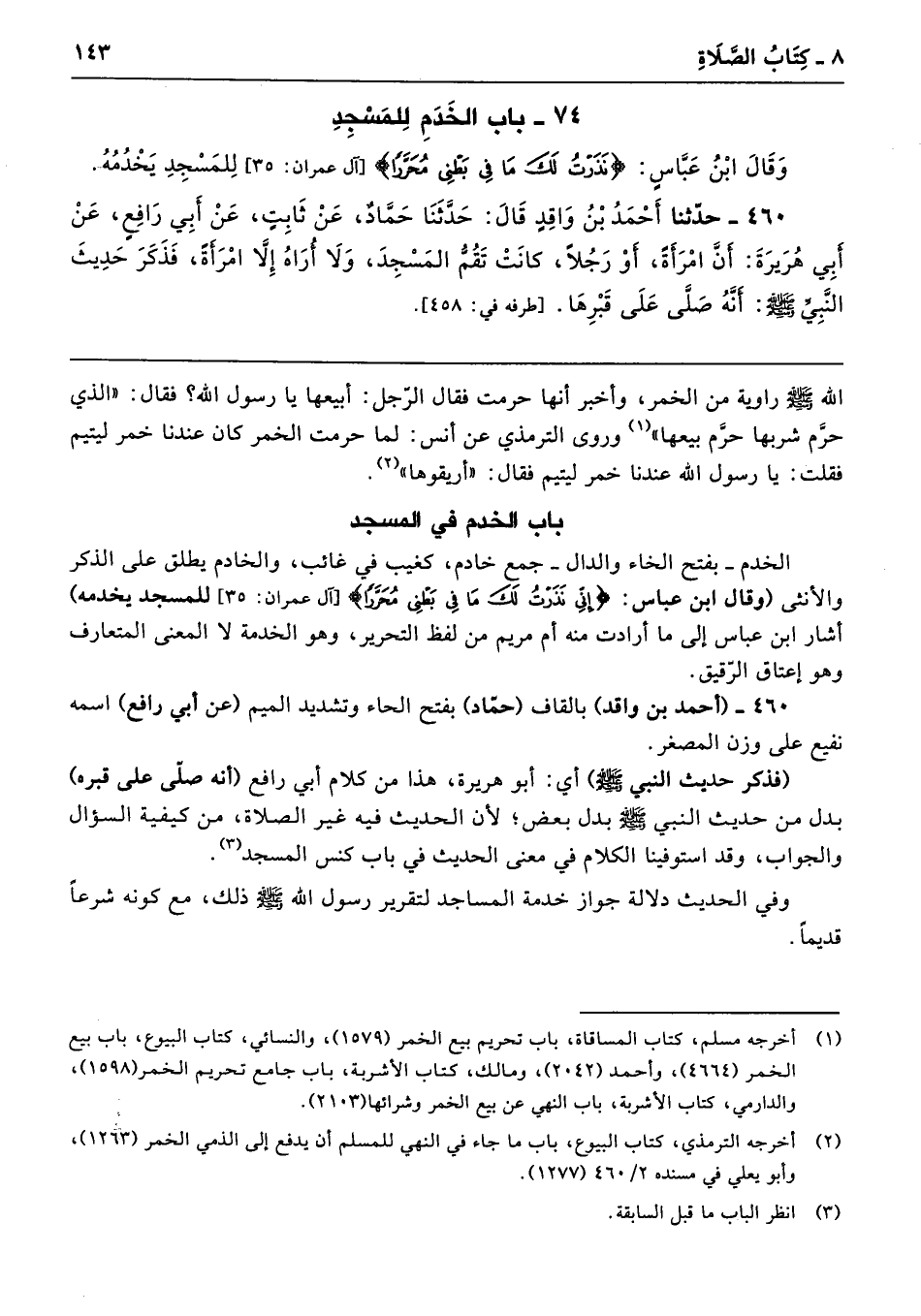 الخدم -بفتح الخاء والدال- جمع خادم، كغيب في غائب، والخادم يطلق على الذكر والأنثى (وقال ابن عباس: {إِنِّي نَذَرْتُ لَكَ مَا فِي بَطْنِي مُحَرَّرًا} [آل عمران: 35] للمسجد يخدمه) أشار ابن عباس إلى ما أرادت منه أم مريم من لفظ التحرير، وهو الخدمة لا المعنى المتعارف وهو إعتاق الرّقيق.
