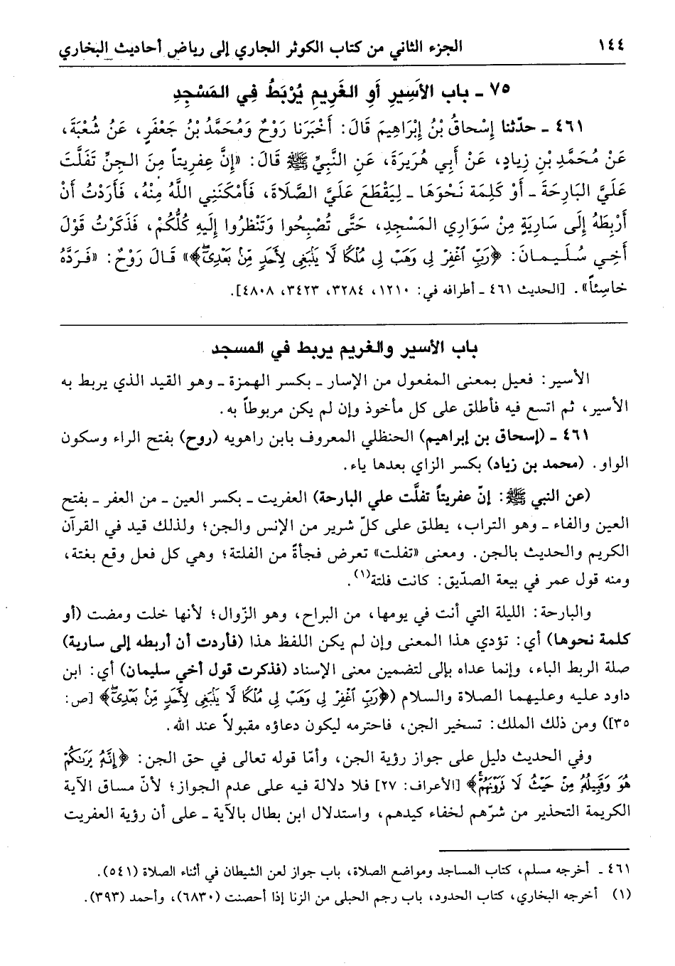 461 - حَدَّثَنَا إِسْحَاقُ بْنُ إِبْرَاهِيمَ قَالَ أَخْبَرَنَا رَوْحٌ وَمُحَمَّدُ بْنُ جَعْفَرٍ عَنْ شُعْبَةَ عَنْ مُحَمَّدِ بْنِ زِيَادٍ عَنْ أَبِى هُرَيْرَةَ عَنِ النَّبِيِّ - صلى الله عليه وسلم - قَالَ «إِنَّ عِفْرِيتًا مِنَ الْجِنِّ تَفَلَّتَ عَلَىَّ الْبَارِحَةَ - أَوْ كَلِمَةً نَحْوَهَا - لِيَقْطَعَ عَلَىَّ الصَّلاَةَ، فَأَمْكَنَنِى اللَّهُ مِنْهُ، فَأَرَدْتُ أَنْ أَرْبِطَهُ إِلَى سَارِيَةٍ مِنْ سَوَارِى الْمَسْجِدِ، حَتَّى تُصْبِحُوا وَتَنْظُرُوا إِلَيْهِ كُلُّكُمْ، فَذَكَرْتُ قَوْلَ أَخِى سُلَيْمَانَ رَبِّ هَبْ لِى مُلْكًا لاَ يَنْبَغِى لأَحَدٍ مِنْ بَعْدِى». قَالَ رَوْحٌ فَرَدَّهُ خَاسِئًا. أطرافه 1210، 3284، 3423، 4808