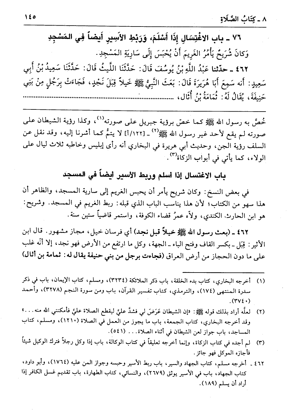 462 - (بعث رسول الله - صلى الله عليه وسلم - خيلًا قبل نجد) أي فرسان خيل، مجاز مشهور. قال ابن الأثير: قِبَل -بكسر القاف وفتح الباء- الجهة، وكل ما ارتفع من الأرض فهو نجد، إلا أنّه غلب على ما دون الحجاز من أرض العراق (فجاءت برجل من بني حنيفة يقال له: ثمامة بن أثال)