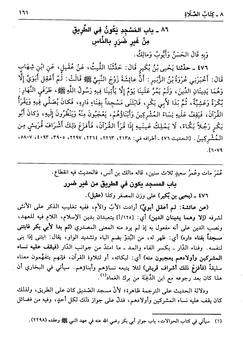 476 - حَدَّثَنَا يَحْيَى بْنُ بُكَيْرٍ قَالَ حَدَّثَنَا اللَّيْثُ عَنْ عُقَيْلٍ عَنِ ابْنِ شِهَابٍ قَالَ أَخْبَرَنِى عُرْوَةُ بْنُ الزُّبَيْرِ أَنَّ عَائِشَةَ زَوْجَ النَّبِيِّ - صلى الله عليه وسلم - قَالَتْ لَمْ أَعْقِلْ أَبَوَىَّ إِلاَّ وَهُمَا يَدِينَانِ الدِّينَ، وَلَمْ يَمُرَّ عَلَيْنَا يَوْمٌ إِلاَّ يَأْتِينَا فِيهِ رَسُولُ اللَّهِ - صلى الله عليه وسلم - طَرَفَىِ النَّهَارِ بُكْرَةً وَعَشِيَّةً، ثُمَّ بَدَا لأَبِى بَكْرٍ فَابْتَنَى مَسْجِدًا بِفِنَاءِ دَارِهِ، فَكَانَ يُصَلِّى فِيهِ وَيَقْرَأُ الْقُرْآنَ، فَيَقِفُ عَلَيْهِ نِسَاءُ الْمُشْرِكِينَ، وَأَبْنَاؤُهُمْ يَعْجَبُونَ مِنْهُ وَيَنْظُرُونَ إِلَيْهِ، وَكَانَ أَبُو بَكْرٍ رَجُلاً بَكَّاءً لاَ يَمْلِكُ عَيْنَيْهِ إِذَا قَرَأَ الْقُرْآنَ، فَأَفْزَعَ ذَلِكَ أَشْرَافَ قُرَيْشٍ مِنَ الْمُشْرِكِينَ. أطرافه 2138، 2263، 2264، 2297، 3905، 4093، 5807، 6079