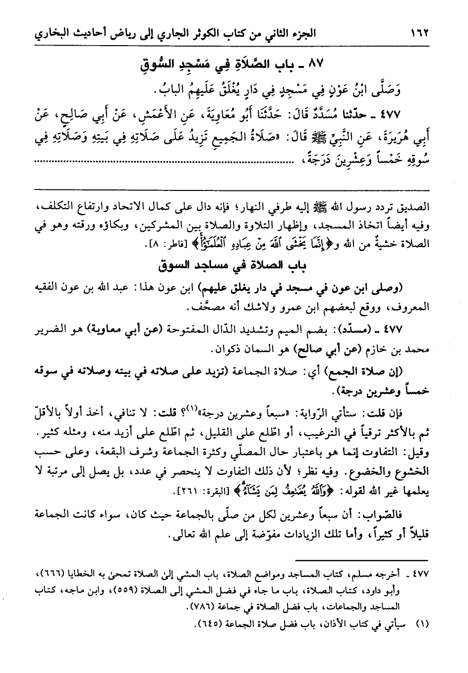 477 - (مسدّد): بضم الميم وتشديد الدّال المفتوحة (عن أبي معاوية) هو الضرير محمد بن خازم (عن أبي صالح) هو السمان ذكوان.