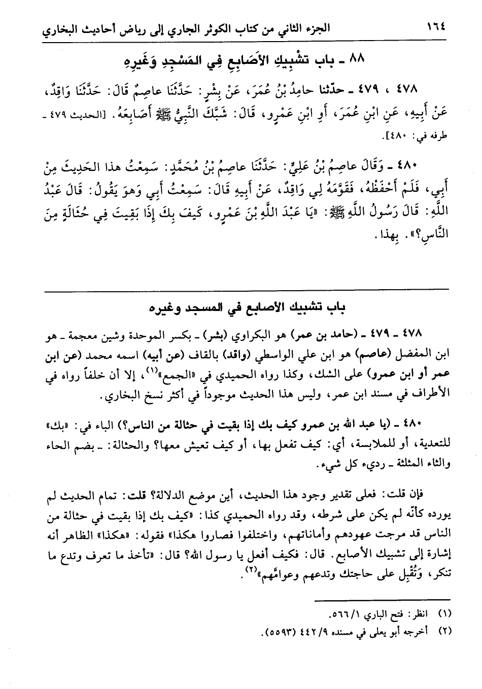 478 و 479 - حَدَّثَنَا حَامِدُ بْنُ عُمَرَ عَنْ بِشْرٍ حَدَّثَنَا عَاصِمٌ حَدَّثَنَا وَاقِدٌ عَنْ أَبِيهِ عَنِ ابْنِ عُمَرَ أَوِ ابْنِ عَمْرٍو شَبَّكَ النَّبِىُّ - صلى الله عليه وسلم - أَصَابِعَهُ. طرفه في 480