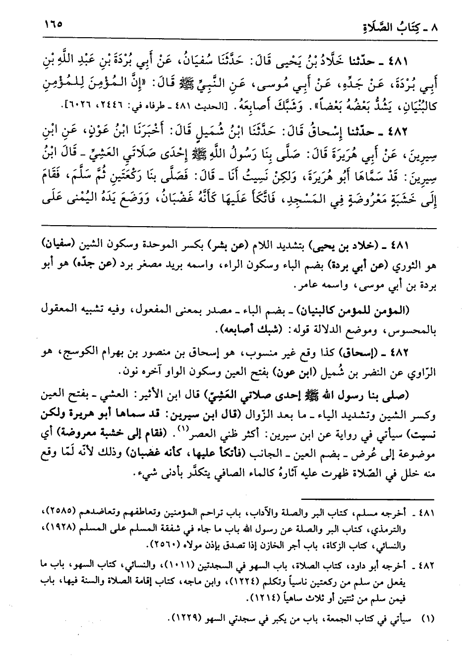 (صلى بنا رسول الله - صلى الله عليه وسلم - إحدى صلاتي العَشِيّ) قال ابن الأثير: العشي -بفتح العين وكسر الشين وتشديد الياء- ما بعد الزوال (قال ابن سيرين: قد سماها أبو هريرة ولكن نسيت) سيأتي في رواية عن ابن سيرين: أكثر ظني العصر. (فقام إلى خشبة معروضة) أي موضوعة إلى عُرض -بضم العين- الجانب (فاتكأ عليها، كأنه غضبان) وذلك لأنّه لَمّا وقع منه خلل في الصَّلاة ظهرت عليه آثارهُ كالماء الصافي يتكدَّر بأدنى شيء.